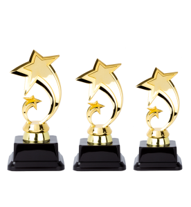 Línea de trofeos en forma de galardón que se otorga a modo de reconocimiento para diferentes premiaciones. Elaborado en material de plástico resistente.